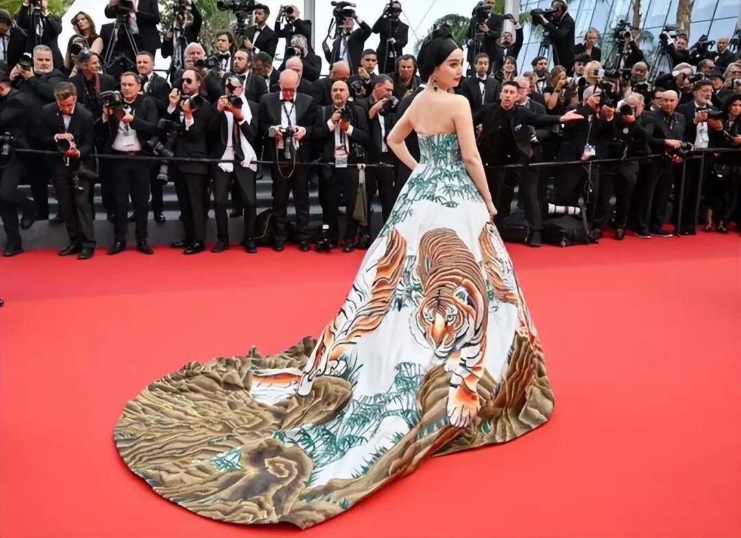 除了以上“看热闹”的红毯行为,今年在电影节上亮相的范冰冰也引发了大量网友的关注和讨论。那天她身穿一件“虎啸林间”的礼服,状态略显沧桑。