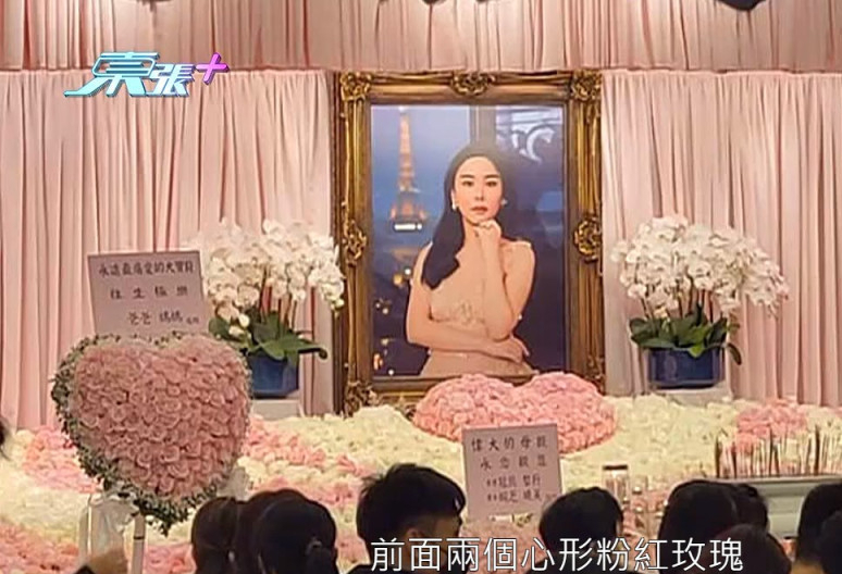 可以看到,灵堂左右两侧摆满了白色的兰花,前面是两个心形的粉红色玫瑰,由蔡天凤的母亲和婆婆送上的。