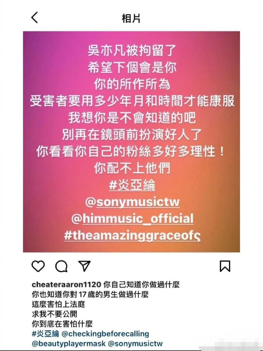 最近WW鱼圈以一己之力顶起内鱼热搜,前脚黄子佼带十几个WW鱼圈艺人下水后,后脚炎亚纶也被曝出X侵未成年同性的瓜,对方还称吴亦凡已经被拘留了,希望下个会是炎亚纶,同时配上两人的私聊记录截图,内容是炎亚纶求对方私下和解不要闹上法庭。到目前炎亚纶这边还没有对外回应,如果真如私信所说,那大概率也不会公开回应,除非对方继续battle下去,搞大事情到他不得不出来给个说法。
