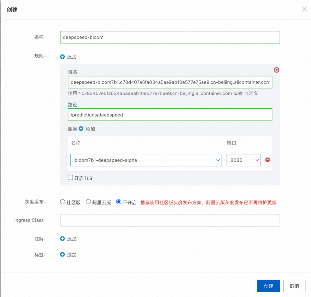 接下来演示如何使用 Arena 命令行工具,在 ACK 容器服务中提交一个 Bloom7B1 模型的单机多卡分布式推理任务,并配置 Ingress 来进行服务访问。