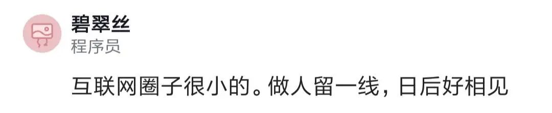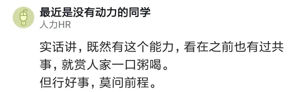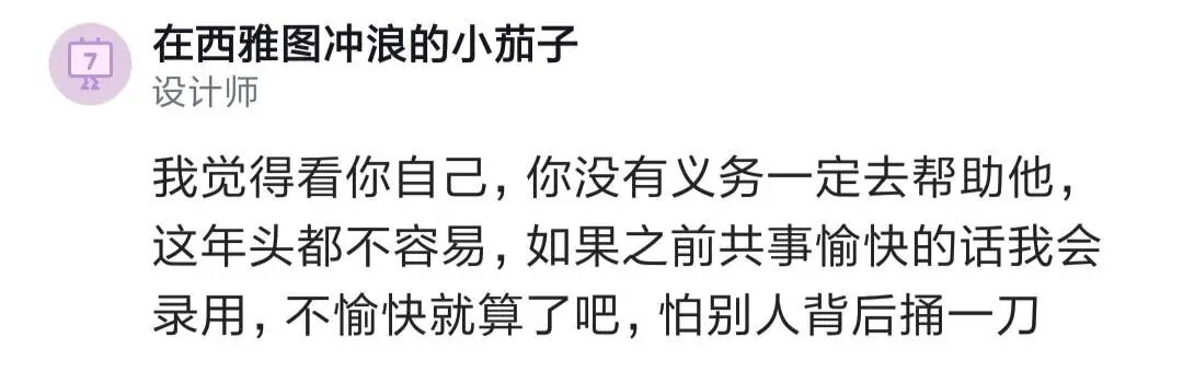 有人说,如果是自己就给他过了,不是帮他,是想帮以后也可能滑进这种局面的自己。毕竟互联网圈子很小,做人留一线,日后好相见。既然之前共事过,那就赏人家一口粥喝。