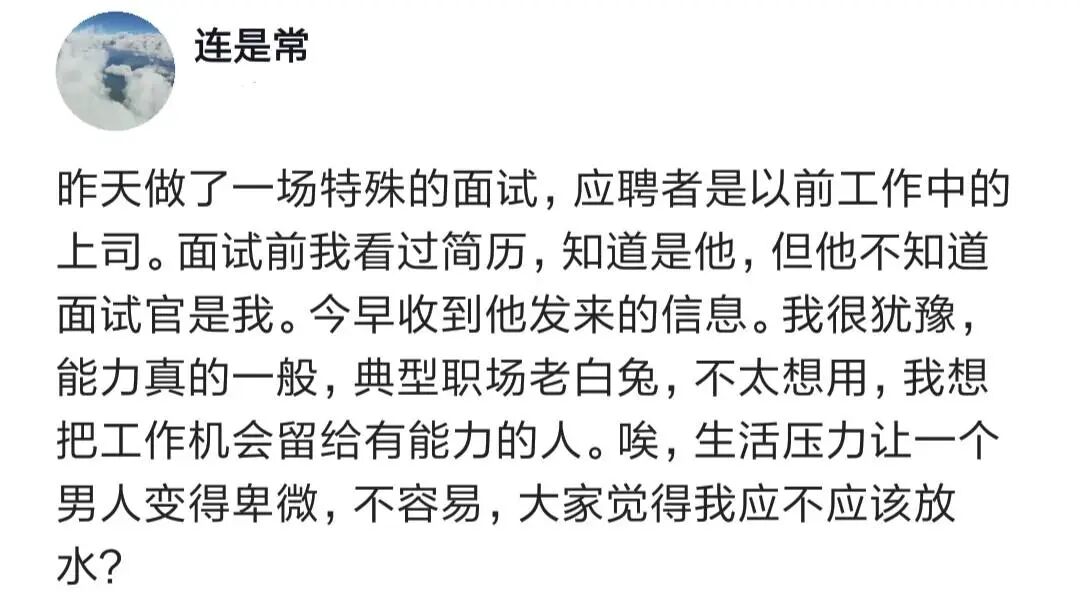 昨天做了一场特殊的面试,应聘者是以前的上司。面试前知道是他,但他不知道面试官是自己。今天早晨收到他发来的信息,很犹豫,因为他能力一般,典型职场老白兔,不太想用他,但又因为他的卑微而不忍。