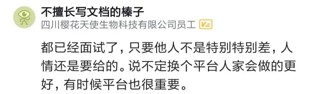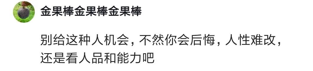 有人说,如果他不是特别不靠谱,能帮就帮一把。大部分人都是普通人,只要不是那么差,能够正向用力,就给困难中的人一个机会,说不定换个平台他会做得更好,再说工作中沟通顺畅很重要。
