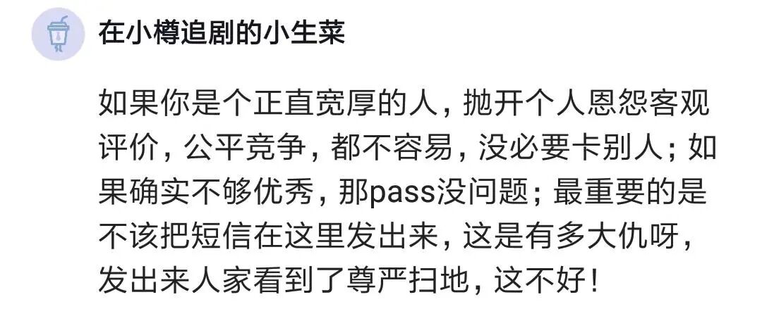 有人劝楼主抛开个人恩怨,客观评价,公平竞争,但无论过不过都不该公开短信。另外,如果觉得不行完全可以不约面试,面试了满足了自己的虚荣心,还要来曝光,实在不厚道。