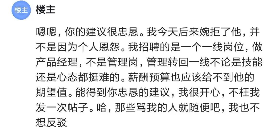 最后楼主回答,自己已经婉拒了他,不是因为个人恩怨,而是因为岗位和能力不匹配,薪资预算也不符合他的期望值。