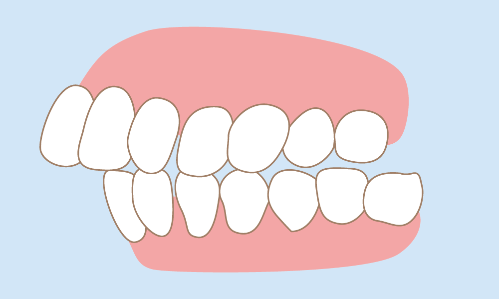 一般表现为牙齿呈严重的倾斜角度,下巴后缩,主要是因为牙列拥挤,牙齿被异常挤出,最终造成上下牙齿翻飞的龅牙感。