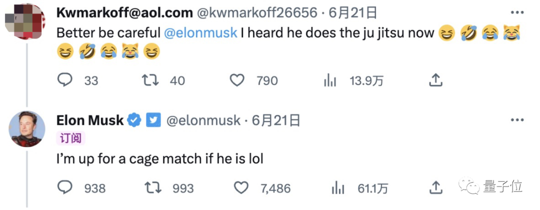 先是51岁的马斯克,在推特上主动发起挑战 ,称要跟39岁的小扎来一场线下“笼斗”。