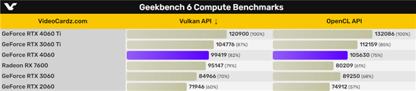 GeekBench数据库里已经出现了RTX 4060,Vulkan测试分数99419,OpenCL测试分数105630,相比于RTX 3060分别高了大约17%、18%,对比RTX 3060 Ti则分别低了5%、6%。