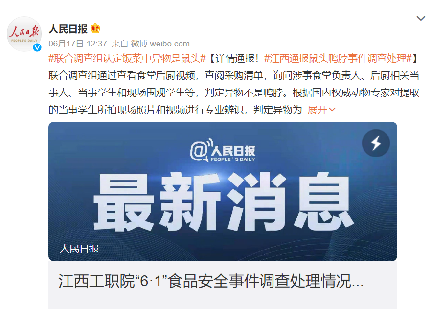 对于江西工业职业技术学院“6·1”食品安全事件,江西省是非常重视的,在舆论滚滚、频频上热搜的背景下,江西省最终成立了省教育厅、省公安厅、省国资委、省市场监督管理局组成的联合调查组,本着实事求是原则开展了调查,最终调查的结果是“老鼠类啮齿动物的头部”。原因很简单,从后来流出较为清晰的视频可以非常清楚地确认,疑似“鼠头”的异物,那大概率就是一个老鼠头。坦率说,事件之初,由于图片模糊,还真不是太好判断,但后来的清晰视频充分显示超高概率就是一颗老鼠头。其实,老百姓的舆论那么大,也正说明了大家对这个问题有明确共识。最终,根据江西联合调查组公布的调查结果确认是个鼠头,当然就不令人意外了。![]()