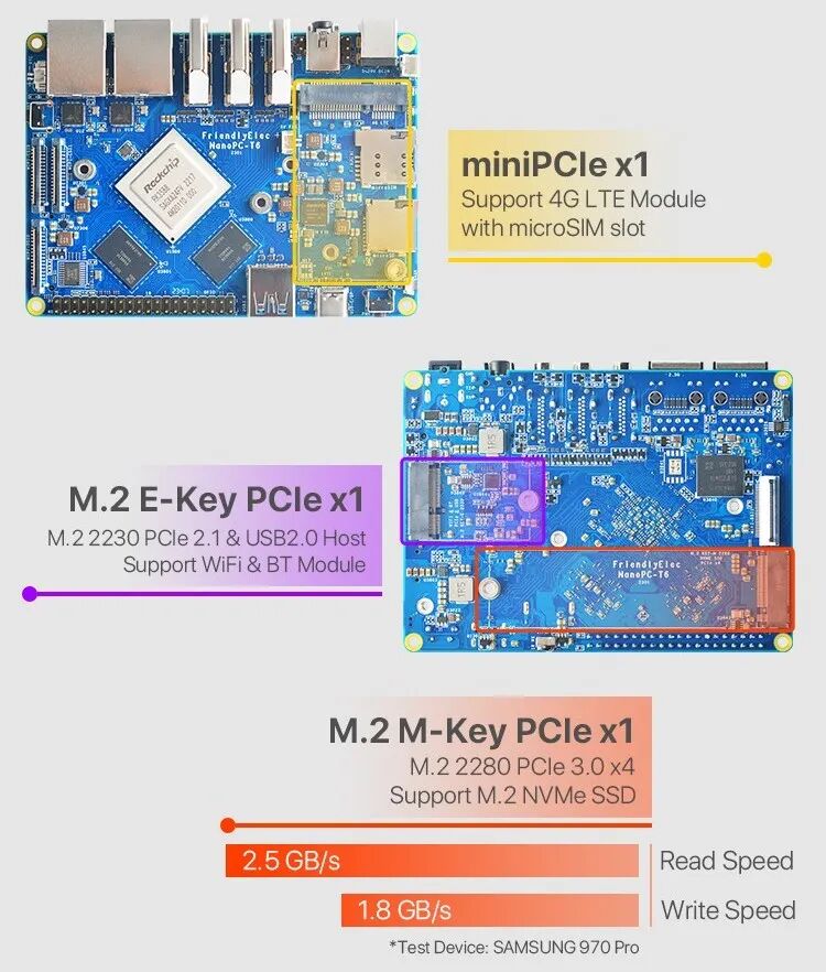 1个M.2 E-Key插槽, 安装M.2 2230尺寸的WiFi无线模块,使用PCIe 2.1 x1和USB2.0 Host通道