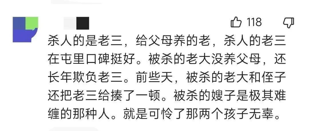 说法二:杀人凶手王某波排行老三,给父母养的老,在屯子里的口碑很好。被杀的一家是老大,没有养父母,还常年欺负老三,嫂子也特别刁钻难缠。特别是这个做哥哥的,租用弟弟的土地盖大棚种蔬菜,十年未付租金。前些天哥哥和侄子刚把老三揍了一顿,而事发前一日老哥俩还在一起喝酒,酒后再次起了争执,常年处于弱势地位的弟弟,怒从心头起,恶向胆边生,立意与哥哥一家同归于尽。哪怕是两个无辜的孩子也不放过,可见恨意之深。上面两种说法,被杀的哥哥和凶手弟弟完全是两种形象,但纵观当地网友的爆料,有两点是比较统一的:第一,哥哥一家儿孙满堂,确实要比单身一人的兄弟幸福美满。第二,哥哥确实是租用了弟弟的土地盖大棚,即使不像传言说的那样“十年未付租金”,也肯定是有拖欠,不然不可能激起亲兄弟如此巨大的恶意。在中国文化中,兄弟亲情非常重要。“兄弟情深”这个成语也代表了中国人对兄弟之间感情的重视和珍视。尤其是在古代社会,兄弟之间的关系更是被视为比夫妻情更重的亲情。孟子就说过:君子有三乐:父母俱在,兄弟无故,一乐也。我们日常看到的一些正面事例中,也有很多哥哥为了帮扶弟弟妹妹,甚至不惜与家人闹矛盾。本文中的哥哥,本身比弟弟生活的富足美满,即便不搞道德绑架,不要求他去帮扶弟弟,但至少租借弟弟的土地,应该规规矩矩付租金。我们之前的文章里,提到过多次“幸福让”这个词:谁幸福谁让路。这位哥哥自以为是兄长,就可以凌驾弟弟的利益至上,处于弱势的弟弟,面对悍兄恶嫂以及不尊重他的侄儿,长期积蓄的恶意被激发,自然爆发力巨大。两败俱伤,显而易见,哥哥付出的代价要远远大于一无所有的弟弟。而本文中的弟弟,不管有什么样的委屈和苦衷,为了土地之争灭了哥哥满门,甚至连7岁的小孩子都不放过。据凶手自己录制的视频中说,七岁侄孙子甚至在死前哭喊“爷爷”向他求饶,他竟然丝毫不为之所动,可见已经泯灭了人性。最近半年来,凶杀案似乎特别多,似乎我们动不动就听到连杀数人的灭门案、特大凶杀案。这一方面固然是因为网络发达,我们接收信息的渠道多、时效快。另一方面,一个不得不承认的事实:后疫情时代,持久的停摆,漫长的封闭,让整个社会都陷入疫情后遗症。各阶层人等都困于现状,举步维艰,生存法则受到了严重挑战,三年封闭积累了太多戾气,人们的肉体和精神都极为压抑,最近听到很多人讲“活着没意思,生活看不到希望”,在这种思想和精神状态支配下,有些戾气就像装了引信,一触即发,极具杀伤力。而为什么农村凶杀案特别多,而且很多时候杀人的理由无非田间地头那点事,在我们看来并不是多么罪大恶极?原因之一,很多农民一辈子与庄稼打交道,性格朴实、待人真诚。但也有些农民一辈子都没怎么读过书,土地就是他们的衣食父母,他们无法理解也难以接受,自己的赖以生存的根本受到侵犯。就在今年的5月11日,辽宁省丹东东港马家岗村刚刚发生过一起特大凶杀案,一六旬村民因为耕地与另一人起了争执。本来只是一块边角地,只需要村长调停一下即可。没想到村长却是另外一人的亲戚,处理起来有失偏颇。这名老人觉得自己受到了欺负,便一不做二不休,手持杀猪刀一路连砍11人,其中7人当场毙命,7人中有一人甚至只是过路司机,与老人素不相识,糊里糊涂冤死在一个失去理智的人的屠刀下。除此之外,农民虽然学识不多,生活也并不富裕,但他们也有自己的尊严和底线。一旦尊严和底线被别人肆意践踏和触碰,他们就会还击,甚至农民式的强烈自尊和孤注一掷,会让他们的还击格外猛烈,威力巨大。杀人偿命,天经地义,可惜这些行凶的人就算恶有恶报,而那些丧命的人,不管是死有余辜还是无辜,他们再也回不来了,和家人也和这个世界彻底告别。时代艰难,人生不易,在这个戾气弥漫的时节,希望我们每一个人尽量心态平和、与人为善。越是艰难时,越要从容。从容建设既有的生活,适时远离喧嚣的纷争。