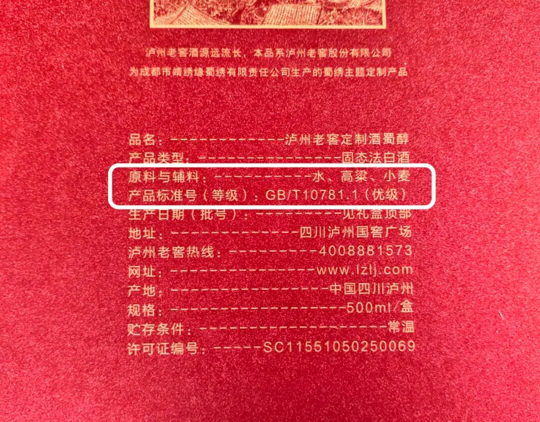 蜀醇酒的执行标准一栏标注GB/T10781.1(优级)四川泸州出产,原料除了高粱、小麦和水再无其他添加,纯粮酿造,浓香正宗。![]()