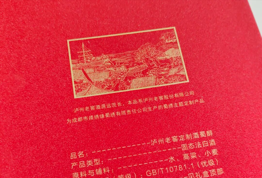 “泸州老窖”四个连在一起的大字,非嫡系不会轻易使用。意为传扬中国“四大名绣”之一的蜀绣非遗文化,古典屏风式设计,盒身和瓶身都有3D立体彩绘的《锦上添花》蜀绣图案。