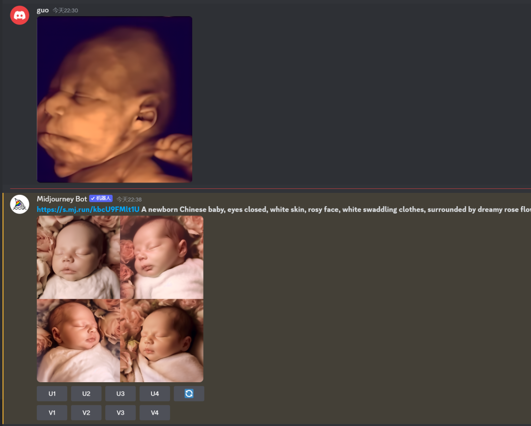 借助四维彩超制作宝宝图,就是借助比较火的Midjourney绘图软件,借助图生图功能制作的,给与一张图作为参考,输入提示词就能制作出来,全程操作下来,前期准备到位,一张图就两分钟搞定。