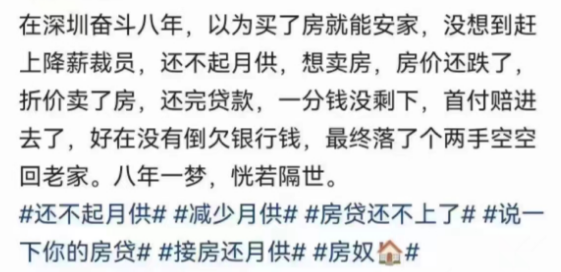 有位软件工程师,毕业后就在深圳打拼,初期月入1.2万,三四年后就涨到了2.6万,于是30岁的他充满希望的买了房安了家。才供了2年多房,他就遇到了互联网的特殊时期,月薪打了个大对折,一怒之下就撂了挑子,选择回家散心。休息了一个月,回到深圳,本以为可以很轻松的继续做他的软件工程师,没想到投出去的简历都基本石沉大海。 别说涨薪了,仅有的几个面试机会,开出的薪酬最高也只有1.5万。生活大打折扣,月供也还不上,只能选择卖房。中介和他说,实际成交价已经下跌了。多番努力之下,终于以290万卖出。已经还了近50万的贷款,大多是利息。幸运的是,没有倒钱银行的钱。就这样,30多岁的年纪,辛苦打拼8年,还是两手空空的回到了老家。看完他的故事,我的心情也五味杂陈。市场越悲观,政策之手确定性越高,毕竟地产还是需要健康发展的,史诗级救市可能就在不远处。可对于个人来说,这两年互联网行业的飞速增长已经成为过去时,叠加整个大环境不好,各企业为了活下去,开源节流就是最简单有效的选择。被裁的年轻人,大可以潇洒转身,以低姿态相对低的价格转行拼一个可能性。而中年人肩上的责任太多,就光上有老下有小这几个字,就注定他经不住一点风吹草动。已经听到过好几个朋友,人毕业后在大城市打拼数十年,好不容易事业有了起色,生活条件也改善了些,却因为一场意外,花掉所有积蓄。 我自己也是一步步摸爬滚打出来后磕磕碰碰,这期间经历过太多,听到过不少悲剧,因此常劝过身边人一定要以此为戒。这两天刷到一个视频,感触挺深的,也发出来给大家看看。35岁的周立军在上海打拼多年,兢兢业业挣工资、买房子,但最近发生的事将他逼得几近崩溃。