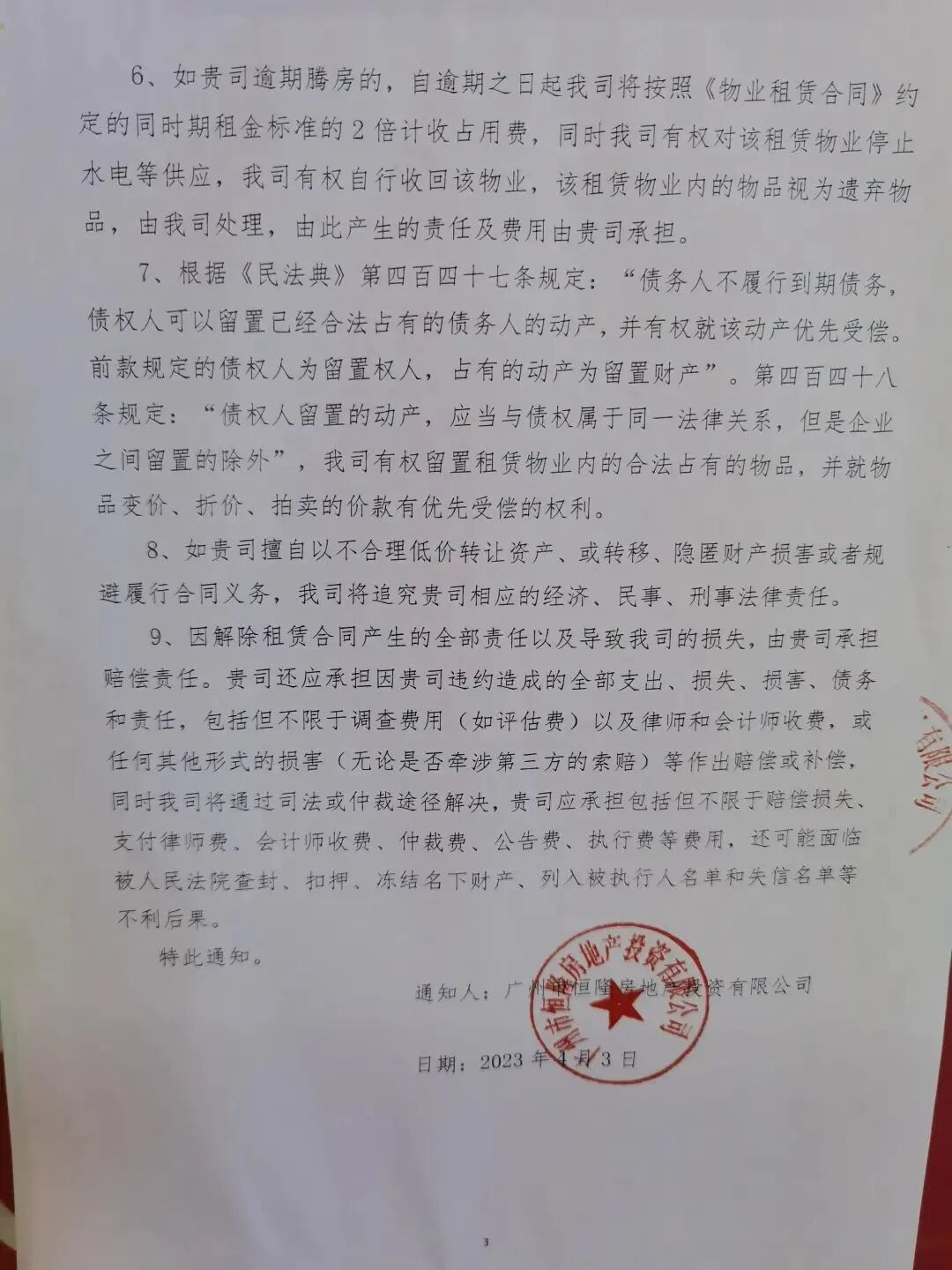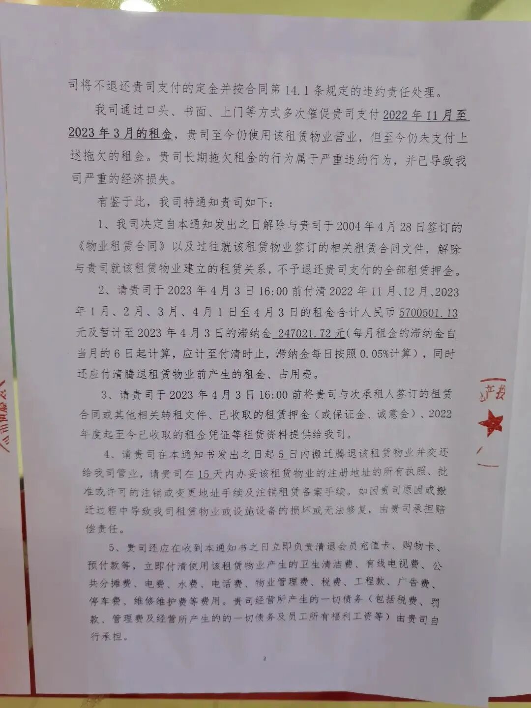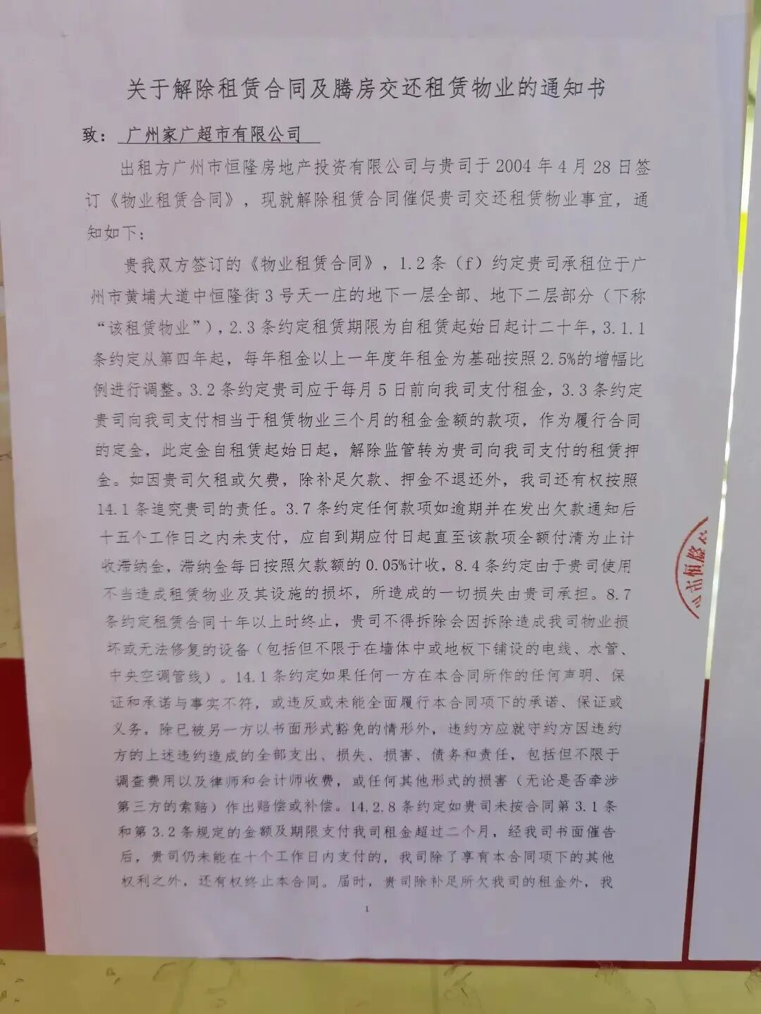 其实早在今年的4月1日,家乐福员村店业主方就已经张贴过“关于解除租赁合同及腾房交还租赁物业的通知书”,称该门店拖欠2022年11月至2023年3月租金未交。