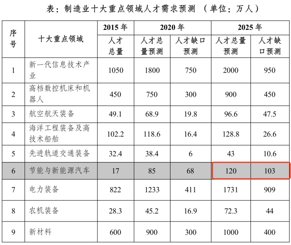 这些我们曾认为流水线上的工作,紧缺程度比想象中要大。原因除了年轻人不太愿意进入需要付出更多劳力,有点枯燥,说出来并不太高端的制造业之外,也和现在制造业本身在不断的升级有关。比如,汽车制造业的升级,就带来了新能源车工的紧缺和薪资增长。到2025年新能源人才,总量预测达到120万人,而其中缺口足足有103万。