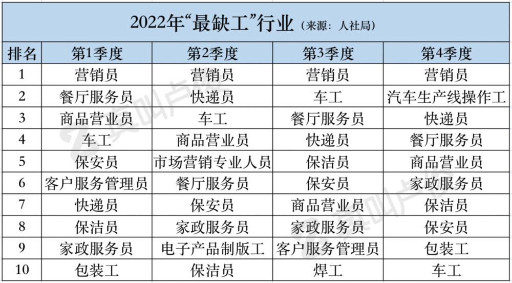 人社局每个季度会定点监测102个城市公共就业服务机构人力资源市场,统计最缺工的行业TOP100,作为数据参考。