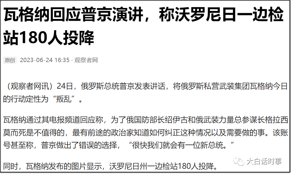结果,一觉醒来就吃了瓦格纳的大瓜,只能说地球大区优秀的匹配机制,论整活还得看大毛和二毛,实乃卧龙凤雏。强调一下,现在局势千变万化,谁也不敢说一定会怎么样,我也只能帮大家梳理一下纷乱的信息。首先,可以排除所谓演双簧的可能性,因为没人会在可能动摇国本的事情上,去搞这种双簧,负面影响太大了。普京已经发表电视讲话,将瓦格纳今天的行动定性为“叛乱”。普京称:“我们将保卫我们的国家免受内部叛乱之害”。而瓦格纳通过其电报频道回应称,普京做出了错误的选择,“很快我们就会有一位新总统。” 当然,我们这里还是不要把瓦格纳当做一个整体,毕竟武装叛乱这样的事情,不可能在这样一个有数万人规模的团体里,达成完全一致性,有人同意,也肯定有人反对。这里主要可以确定的是,瓦格纳负责人“普里戈任”是确实进行了武装叛乱,并且有一定规模的人支持他进行这样的武装叛乱,具体有多少,目前还不得而知。先来对这件事情的来龙去脉做一个分析,毕竟大家如果不是长期关注俄乌局势,可能对瓦格纳为何会叛乱,不太清楚。先来说说这次发动武装叛乱的瓦格纳负责人“普里戈任”。普里戈任是1961年出生,1981年在20岁的时候,就因为抢劫、偷窃、诈骗等罪名入狱。在1990年提前获释后,普里戈任上大学,兼职卖热狗,开始自己的“餐饮”之路。1996年,普里戈任在圣彼得堡市开了家高档餐厅,开始组建“餐饮”帝国。普京曾经在普里戈任的餐厅接待来访的法国总统希洛克和美国总统小布什。这也很正常,瓦格纳这样的私人武装,普京也不可能交到一个他不信任的人身上。本来普里戈任的主要业务就是集中在餐饮、建筑、媒体上,并无明面上公开涉足私人武装。而瓦格纳是2014年正式创立,一开始的创始人乌特金中校,但人们普遍认为乌特金跟普里戈任关系密切。一直到2022年9月26日,普里戈任才承认瓦格纳是他的私人产业。瓦格纳虽然是私人武装集团,明面上跟俄罗斯正规军没关系。但从2014年至今,瓦格纳参与了俄罗斯在叙利亚、乌克兰的军事行动,也在非洲参与保护油田和输油管道等行动。所以,基本也可以认为,瓦格纳是受俄罗斯实际控制的私人武装集团。特别是在俄乌冲突爆发后,瓦格纳在俄乌战场上参与程度越来越深,瓦格纳的规模也越来越大,从一开始数千人,扩张到数万人的规模。瓦格纳早期骨干人员,是俄罗斯一些退伍军人,训练有素。2008年-2012年,俄罗斯军改,取消14.2万准尉编制,军官数量从33.5万人减至15万人。在俄乌冲突爆发后,瓦格纳则从监狱里招募囚犯,通过高薪吸引这些囚犯,并给他们戴罪立功的机会。2023年1月,普里戈任说第一批上前线的囚犯已完成半年期合同,成为自由身。不过,2023年2月9日,瓦格纳招募囚犯就被叫停。在今年3月18日普里戈津表示,瓦格纳目前每天招募数百名新兵,计划在5月中旬前招募到3万名新兵。瓦格纳并不是只从囚犯里招募,事实上,也有大量退伍军人选择进入瓦格纳。在俄罗斯进行部分动员的情况下,一些人就抱着,反正都要上战场,不如选择更高薪的瓦格纳。从瓦格纳展现出来的战斗素养和战斗力,并不是只有“悍不畏死”。总的来说,瓦格纳主要是由两部分人员组成,退伍军人和囚犯。而退伍军人构成瓦格纳的骨干,确保了整体作战的军事素养。再加上高薪和高额抚恤金刺激下,让瓦格纳整体的作战风格十分彪悍,一些正规军都不敢顶上去的地方,就得靠瓦格纳顶上。比如,前段时间一直是俄乌战场焦点的“巴赫穆特战役”。巴赫穆特本来只是一个小镇,但经过乌克兰8年不断加筑防御工事,已经打造成一个防御暴雷。而且巴赫穆特是一个重要的交通枢纽,自然就成为双方争夺的焦点。今年随着双方在巴赫穆特投入兵力越来越多,巴赫穆特也成为了绞肉机战场,整个小镇也是打成一片废墟。而且巴赫穆特在成为各方注视焦点,除了战场以外,还多了政治因素,让乌克兰不得不进行各种添油战术。而瓦格纳就是俄罗斯进攻巴赫穆特的主力,正规军更多是给瓦格纳炮火支援,但最激烈、也是最残酷的巷战、攻坚战,则主要靠瓦格纳完成。最终,到了一个月前,经过八个月血战,俄罗斯才宣布拿下巴赫穆特,并将其改名为原来名字“阿尔乔莫夫斯克”。这是因为乌克兰在2016年“去俄化”浪潮中,“阿尔乔莫夫斯克”才被乌克兰改名为巴赫穆特。因为瓦格纳在俄乌战场上,屡立战功,表现十分亮眼,也显得俄罗斯正规军打得比较一般。但偏偏瓦格纳是私人武装,名义上还不是俄罗斯正规军,这种反衬,势必会带来矛盾。更何况,瓦格纳薪资和抚恤金都远高于正规军,这种薪资不平衡,也是俄罗斯必须解决的问题。否则就会出现,兵源被瓦格纳不断分流,并且瓦格纳规模不断扩大,最终尾大不掉的局面。所以,基本从5月份开始,瓦格纳和俄罗斯正规军的矛盾,就不断激化。再加上,瓦格纳负责人“普里戈任”是一个口无遮拦的人,什么话都敢说。之前普里戈任就已经说过很多十分过激的话,不断炮轰俄罗斯正规军,特别是炮轰俄罗斯国防部长绍伊古。比如,5月初普里戈任就不断爆粗口,抱怨弹药短缺问题。普里戈任还数次怒骂绍伊古,指责其无能,指挥混乱,导致大量不必要伤亡发生。但普里戈任还能一直活蹦乱跳,这说明俄罗斯确实还比较需要瓦格纳。此外,因为普里戈任的人设一直是这种口无遮拦的风格,所以外界也普遍怀疑,他故意