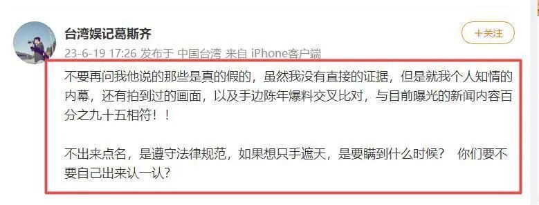 然而,台湾著名娱乐记者葛斯齐很快公开表示支持黄子佼,他直接说:“95%的爆料都是真的。”他甚至透露自己拍到过一些照片,警告艺人们注意行为。