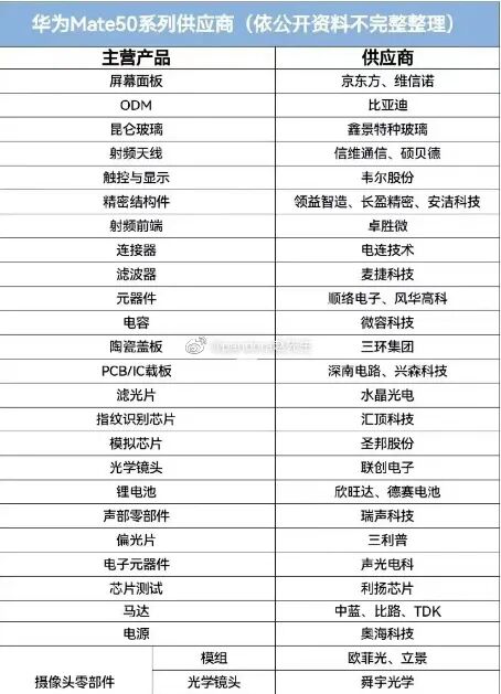 相比上一代产品来说,Mate 50 除了处理器方面不能使用自研外,电源 IC、指纹传感器、屏幕、电池、OLED 屏幕芯片控制等均来自国产供应链,以及自研产品。