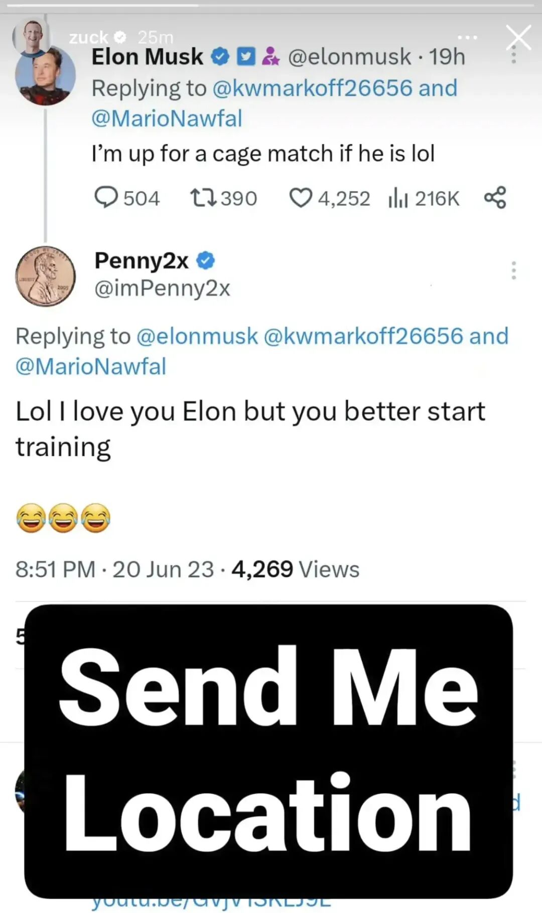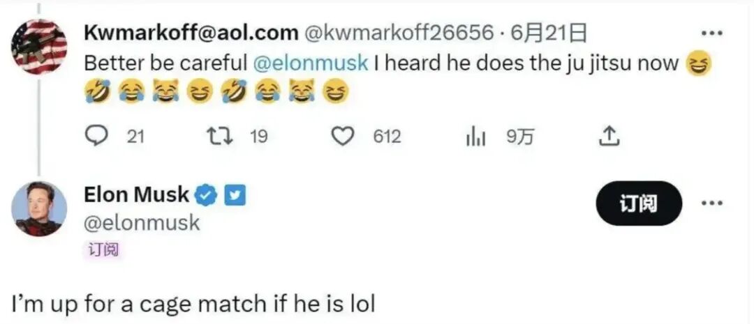 马斯克称要与扎克伯格来一场格斗赛。来源:Twitter截图