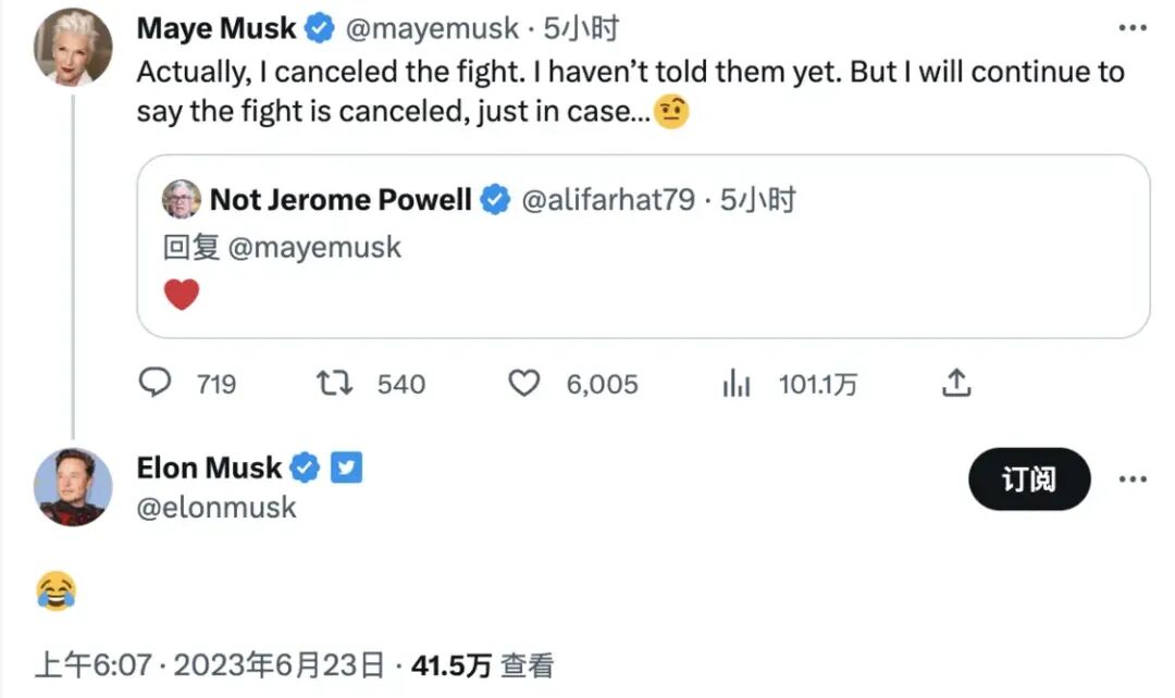 吃瓜群众虽然希望看到两人真正较量一下,但是马斯克的母亲梅耶(Maye)并不支持。梅耶提醒自己的儿子,打打口水仗就行了,不要来真格的。
