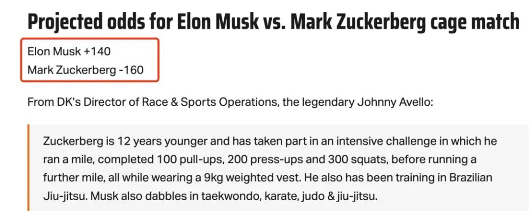 面对这场突如其来的富豪约架,体育博彩公司赶忙发布了他们的胜负赔率。美国知名体育博彩公司DraftKings认为,扎克伯格的赢面更大,毕竟扎克伯格今年只有39岁,而马斯克为51岁。