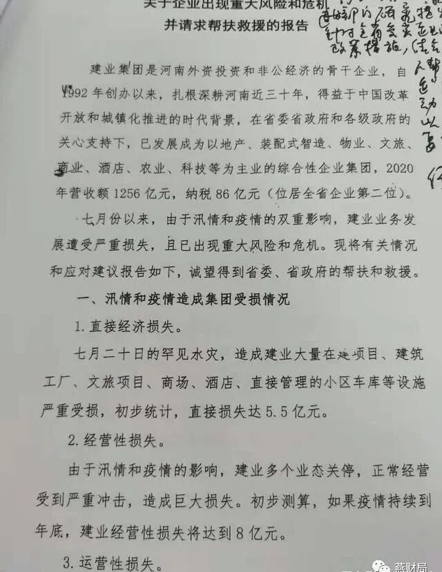 两年前网上流传一份建业《关于企业出现重大风险和危机并请求帮扶救援的报告》,这封“求助信”一度冲上热搜。