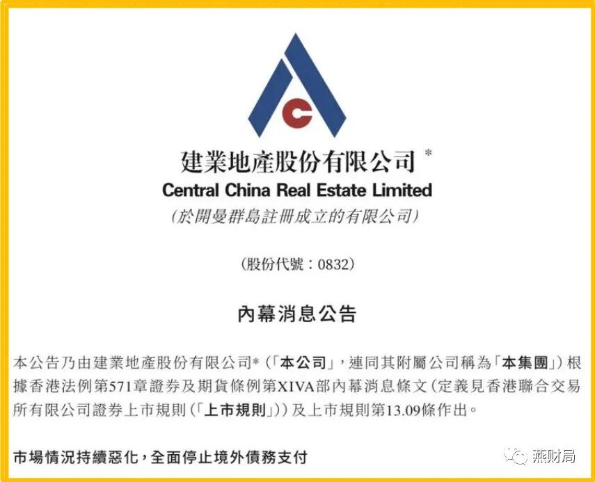 昨夜,建业地产(0832.HK)在港交所公告,大意为因销售差、资金紧张加剧,竭尽全力仍无力在6月23日宽限期结束前支付7.75%优先票据的利息;同时为确保公平,将暂停向所有境外债权人进行支付。