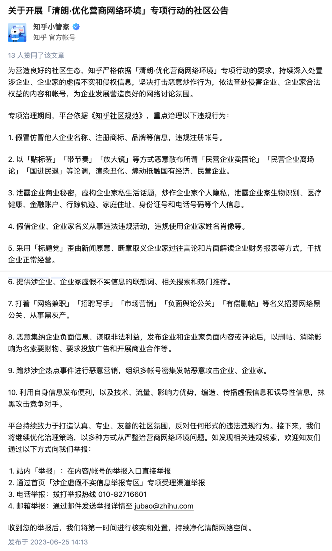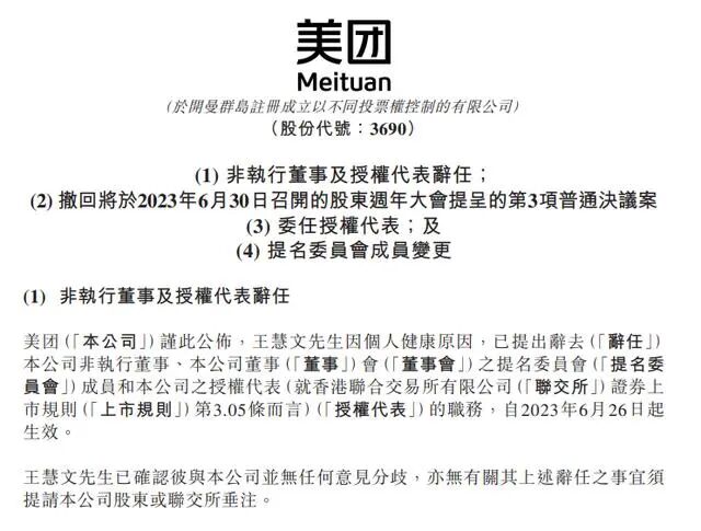 【王慧文因个人健康原因辞任美团董事】美团发布公告称,王慧文因“个人健康原因”申请辞去美团董事。此前,王慧文已由美团执行董事转为非执行董事。当日下午,媒体援引知情人士消息称,王慧文近期已暂时离开工作岗位,处于休养就医状态。今年2月,王慧文曾在社交平台发文宣布进入AI领域,设立北京光年之外科技有限公司,出资5千万美元,估值2亿美元,自有资金占股25%。据其彼时透露,下轮融资已有顶级VC认购2.3亿美金。源自光年之外内部知情人士称,王慧文5月中出现一些健康问题,疑现抑郁类症状。王慧文的暂时离岗对公司整体运营或将产生一定影响。(澎湃新闻)【17K小说网创始人刘英病故,终年42岁】17K小说网6月24日晚间于官微发布讣告:17K小说网创始人刘英(编辑名:血酬)于2023年6月24日下午在北京市和平里医院病故,享年42岁。据介绍,刘英曾创建17K小说网、汤圆创作等文学网站并担任总编辑。(中国青年报)【马斯克:大幅调整后,SpaceX“星舰”再次试射的成功机会大增】马斯克表示,在4月首次试射失败后,SpaceX已对“星舰”实行了“远超1000处调整”。他指出,SpaceX已改变飞行器通往轨道的运作方式,再次尝试试射的成功机会大增,“也许是60%,取决于我们在级间分离方面做得如何”。(财联社)【香港恒大中心更名,马云旗下公司入主】港股上市公司云锋金融公告称,其注册办事处及主要营业地点所在大厦由“中国恒大中心(即香港恒大中心)更名为万通保险中心”。万通保险为马云和虞锋控股的企业云锋金融旗下公司。2017年,云锋金融与其他投资者对美国万通旗下负责香港、澳门业务的万荣亚洲发起收购,斥资131亿港元。云锋金融占万通亚洲已发行股本的60%,其他投资者占40%。(21财经)![]()