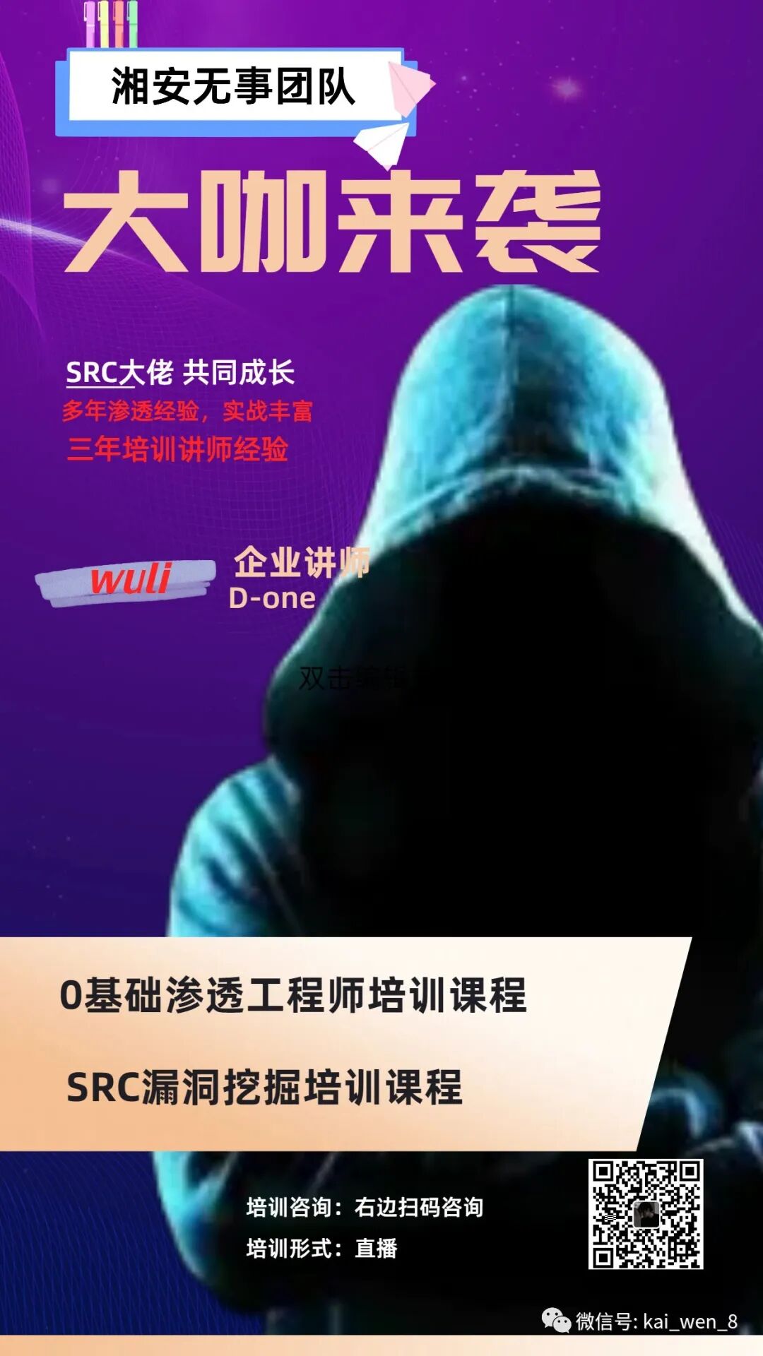 湘安无事团队创始人推出"0基础SRC赏金漏洞课程",课程主讲师"wuli"是拥有多年渗透经验、实战经历丰富,并有三年培训讲师相关经历,拥有丰富赏金漏洞挖掘经验,获得多次单个五位数漏洞赏金,累计漏洞赏金已达六位数之余。SRC课程还拥有团队嘉宾做技术分享。
