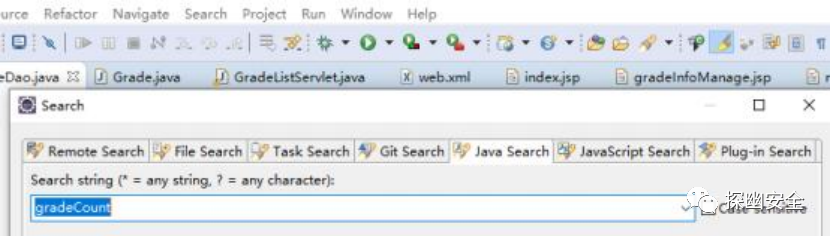 从上面代码我们可以发现grade.getGradeName变量存在SQL语句拼接,同时我们也可以看出来gradeCount 这个方法中没有对 grade.getGradeName 进行过滤,我们往前跟踪下,看下调用该 dao的service 层有没有进行过滤该变量,那么怎么往前跟踪呢?我们只需要看哪些方法调用了gradeCount 这个方法即可,eclipse中只需要点击search 搜索即可:我们搜索时发现GradeListServlet里面的doPost 方法调用了gradeCount方法: