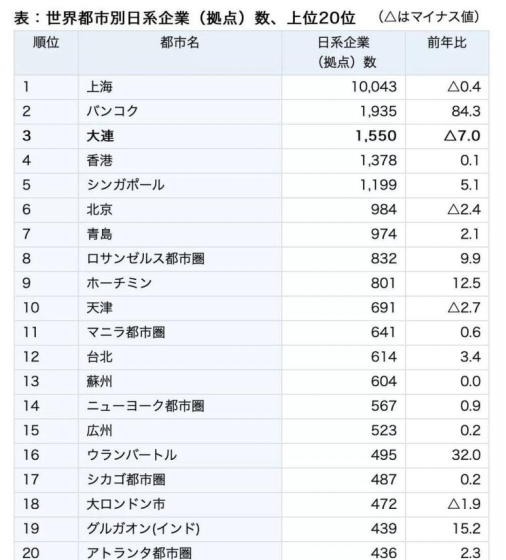 大连的日企数量虽然在下降,但仍在全球排第三位