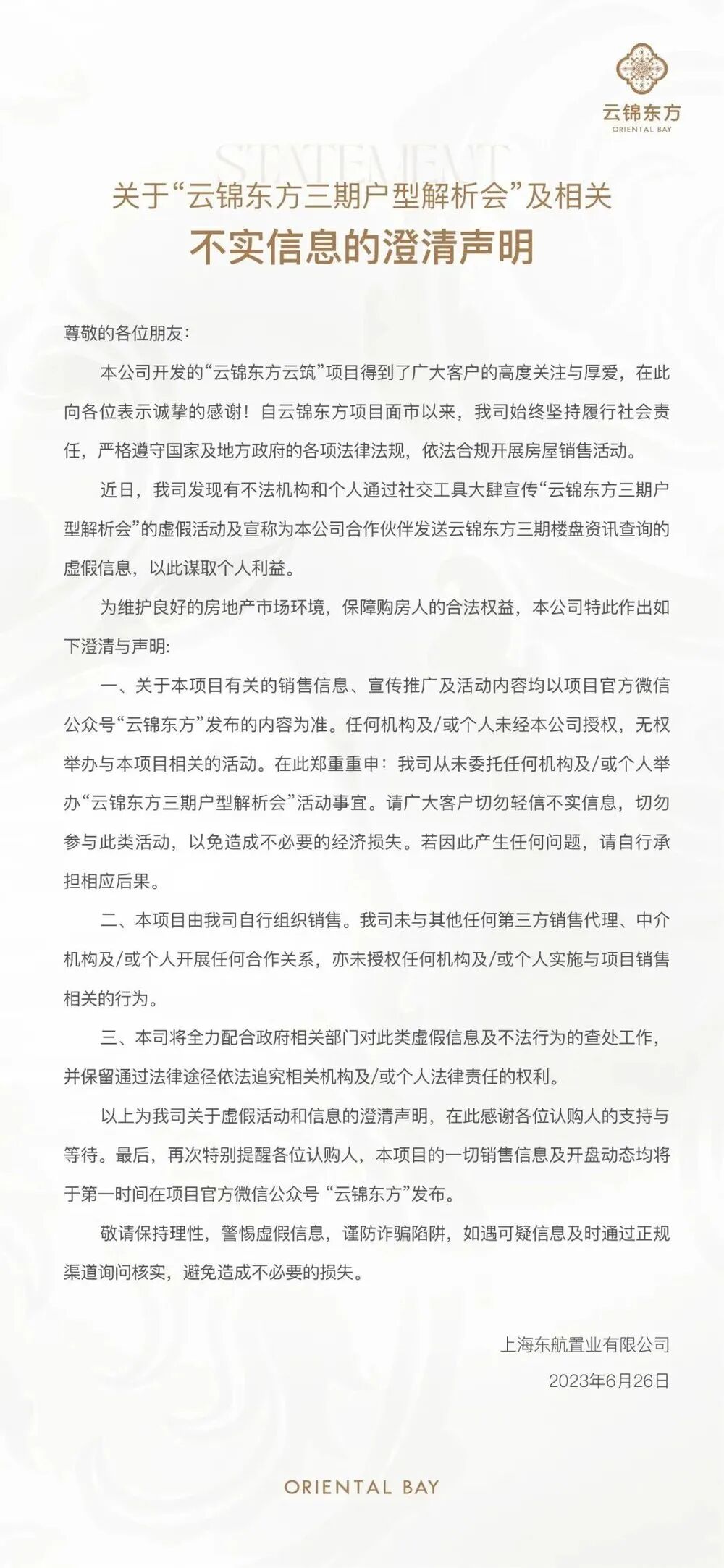 上海东航置业有限公司6月26日在云锦东方微信公众号发布澄清声明。近日,该公司发现有不法机构和个人通过社交工具大肆宣传“云锦东方三期户型解析会”的虚假活动及宣称为该公司合作伙伴发送云锦东方三期楼盘资讯查询的虚假信息,以此谋取个人利益。上海东航置业称,关于该项目有关的销售信息、宣传推广及活动内容均以项目官方微信公众号“云锦东方”发布的内容为准,该公司从未委托任何机构及/或个人举办“云锦东方三期户型解析会”活动事宜;云锦东方项目由公司自行组织销售,公司未与其他任何第三方销售代理、中介机构及/或个人开展任何合作关系,亦未授权任何机构及/或个人实施与项目销售相关的行为。