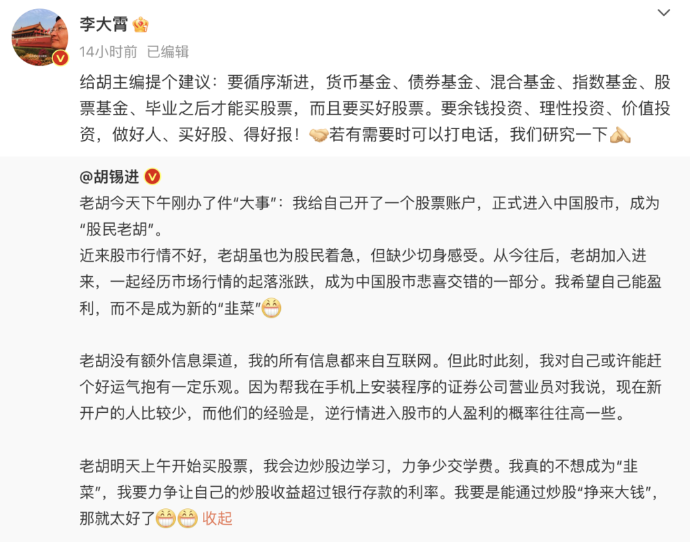 6月26日下午,著名媒体人胡锡进在微博表示,自己开了一个股票账户,正式进入中国股市,成为“股民老胡”。
