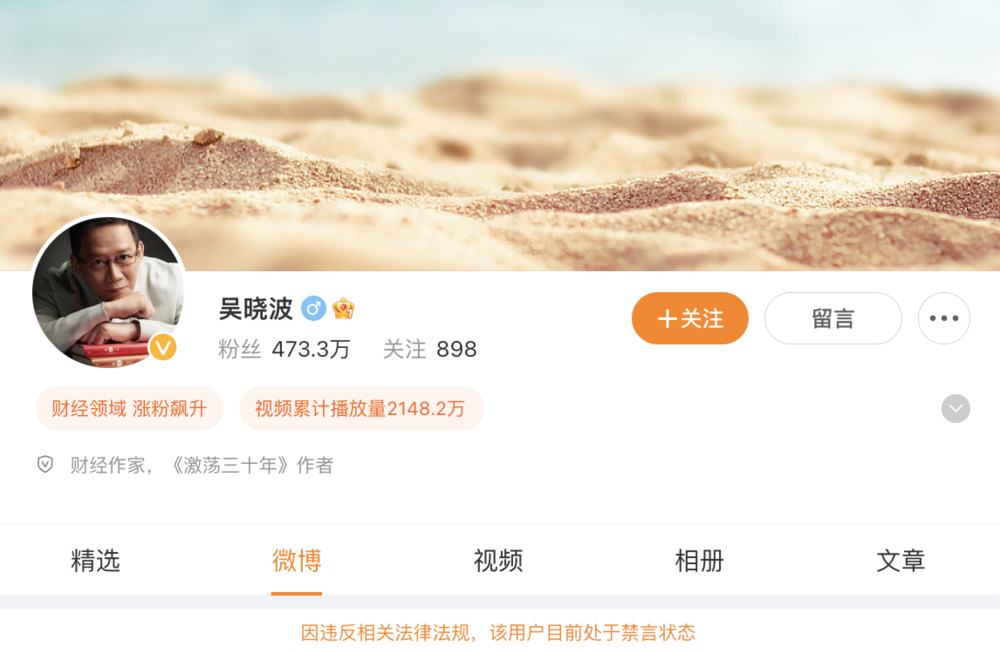 6月26日,财经作家吴晓波微博账号主页显示,“因违反相关法律法规,该用户目前处于禁言状态”。