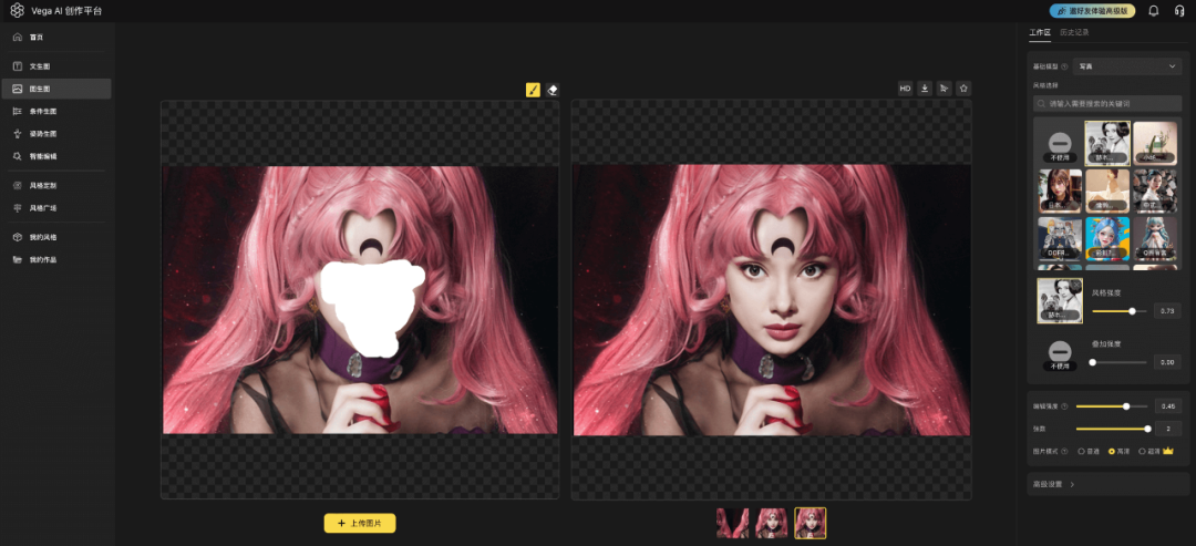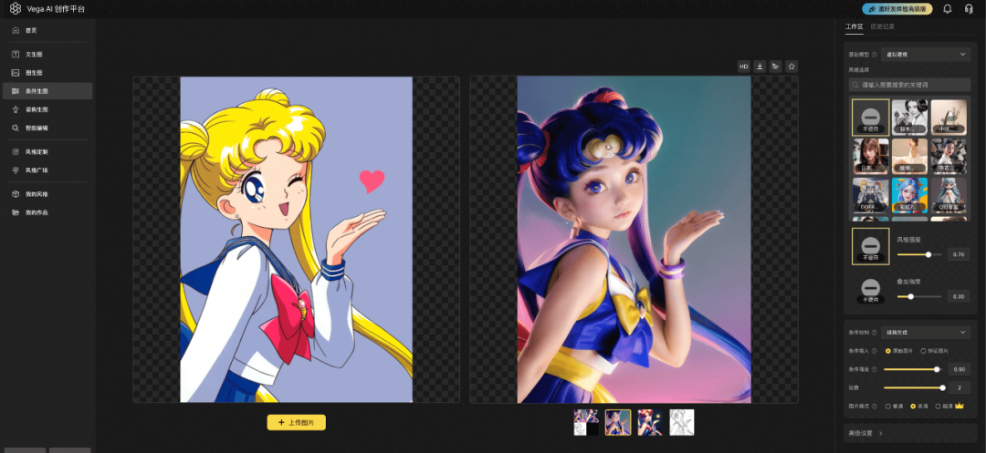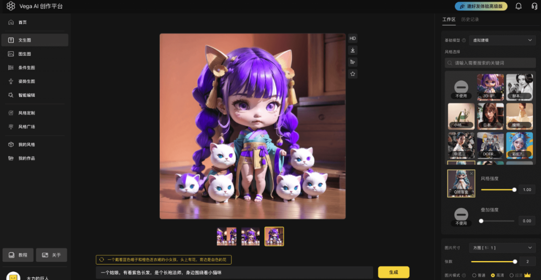 1.生成的图片如需高清,可以直接点击图片上的HD,即可生成分辨率更高的图片;