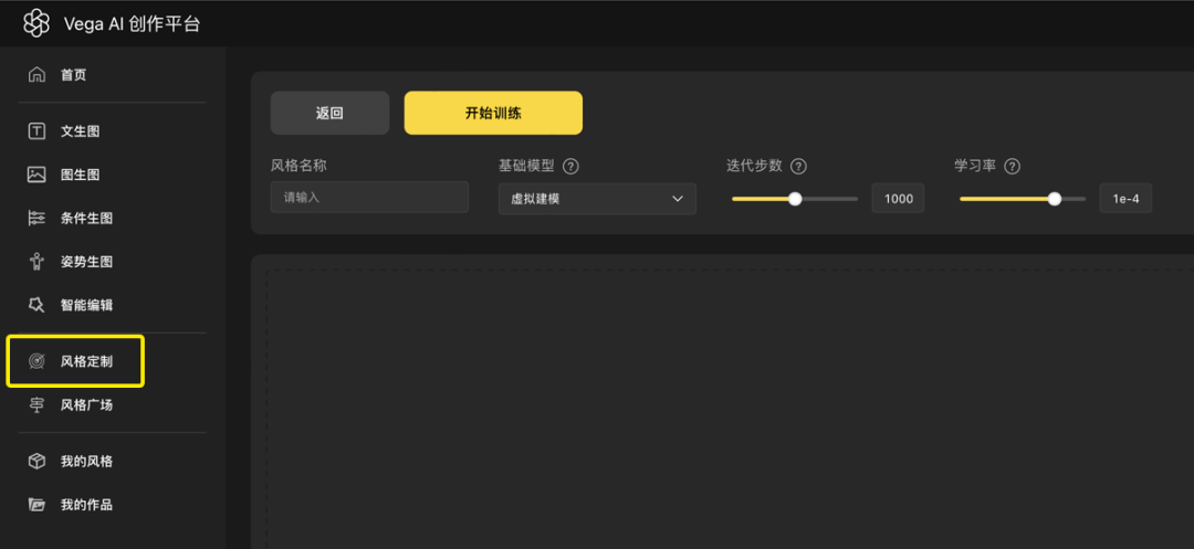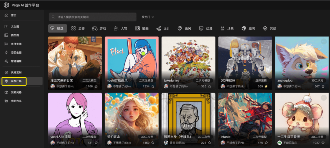 风格广场有大量的各类风格案例,可以查看并直接采用;用户也可以训练模型并上传。