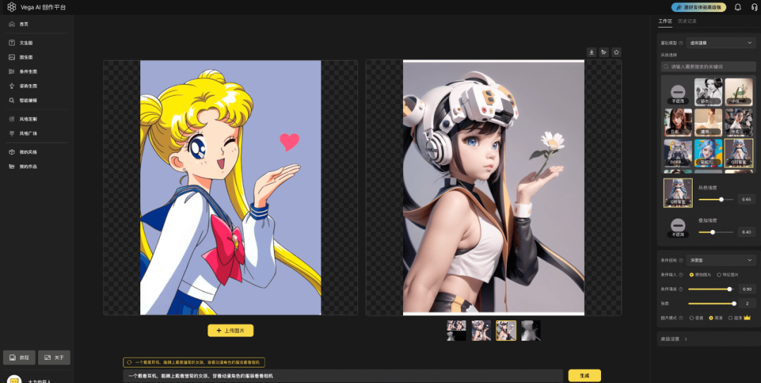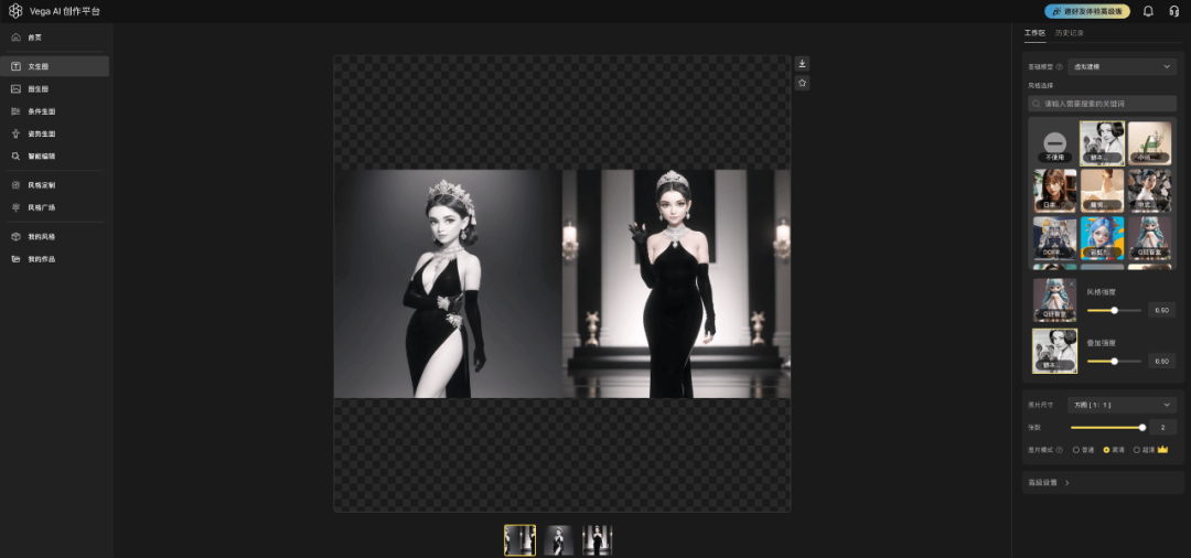 1.图片质量分成:普通,高清和超清,每日普通/高清生成次数上限为200次,超清上线25张。不过做图时系统默认在超清选项上,不注意的话很快就用没有了;