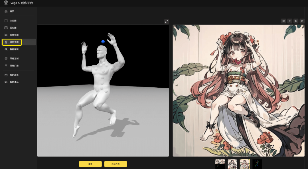 这个功能类似3D软件中的人物骨骼,可以自由拖拽模型上个每个关节,摆出你想要的姿势,还可以变换人物角度和构图,选择风格后生成你想要的画面。此功能整体操作十分流畅,调整的姿势也很舒适,不过生图的还原度还有待提高。