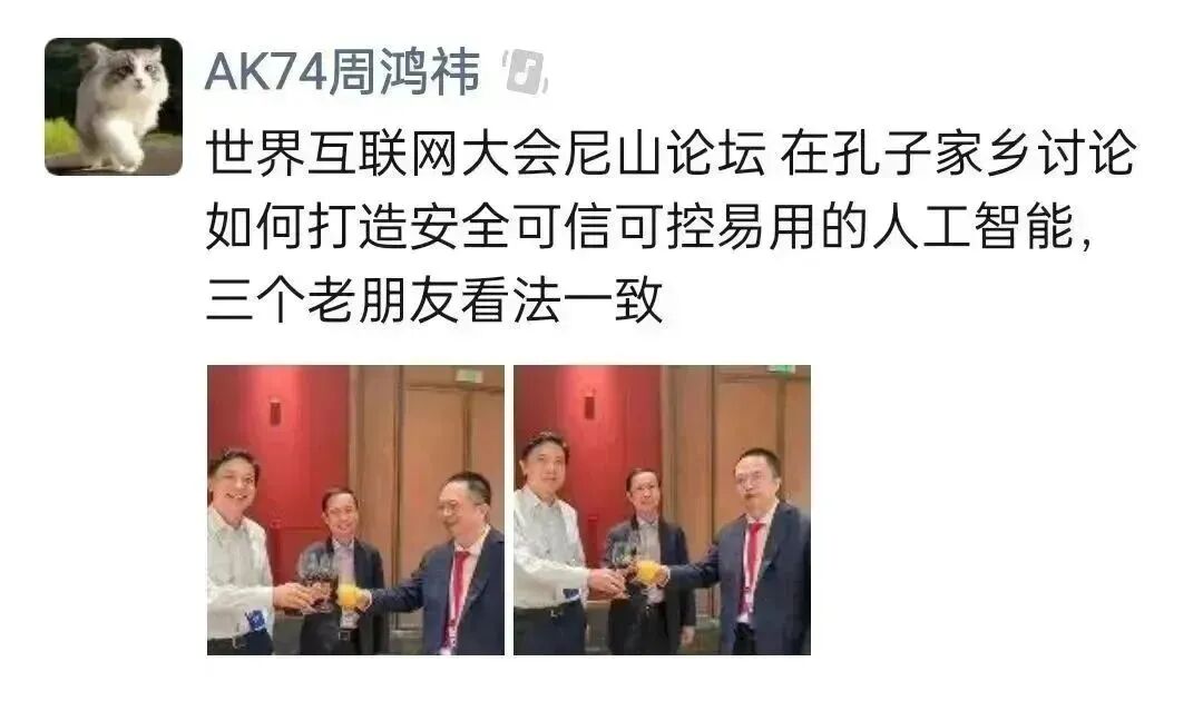 一张百度创始人、董事长兼首席执行官李彦宏,阿里云智能集团董事长兼首席执行官张勇,360创始人周鸿祎拿着红酒、果汁碰杯的照片在微信群流传,第一财经留意到,周鸿祎发了一条朋友圈,称“在孔子的家乡讨论如何打造安全可控易用的人工智能, 三个老朋友看法一致。”