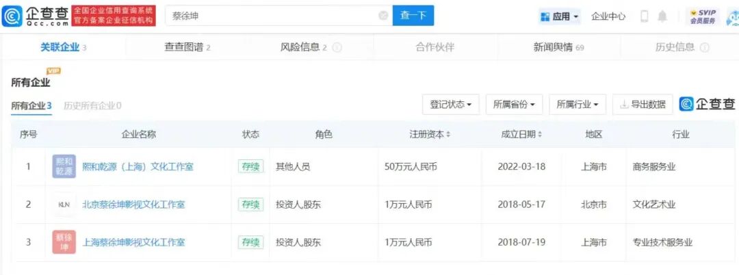 企查查APP显示,蔡徐坤目前共关联3家工作室,包括熙和乾源(上海)文化工作室、北京蔡徐坤影视文化工作室和上海蔡徐坤影视文化工作室,均为个人独资企业。其中,熙和乾源(上海)文化工作室已申请注册多枚“哈密哈密”商标,北京蔡徐坤影视文化工作室已注册多枚“LOVER”“蔡徐坤”“KUN&IKUN”等商标。此外,北京蔡徐坤影视文化工作室与前东家上海依海影视文化传播有限公司之间存在多条司法案件。