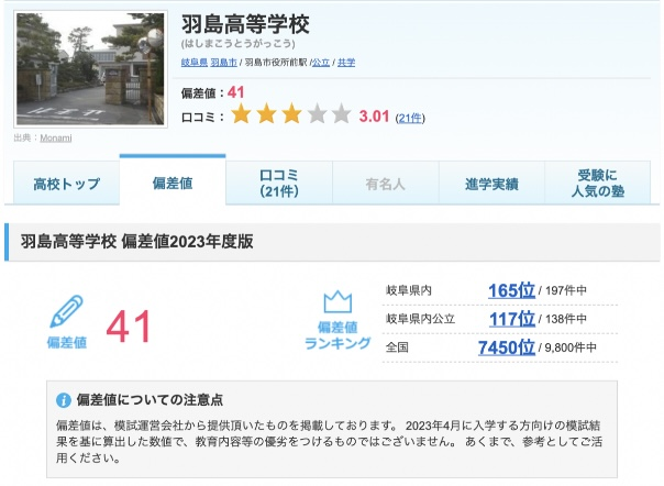 日本社媒称渡边直杜的高中是偏差值41的高中,google评分3.1