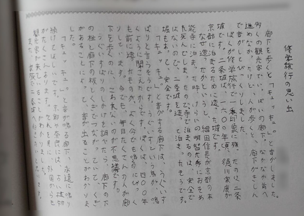 “二条城的地板踩上去就有咯吱咯吱的声,我希望它一直响,很多外国游客会来参观,我也希望有一天能跟家人一起参观二条城。”