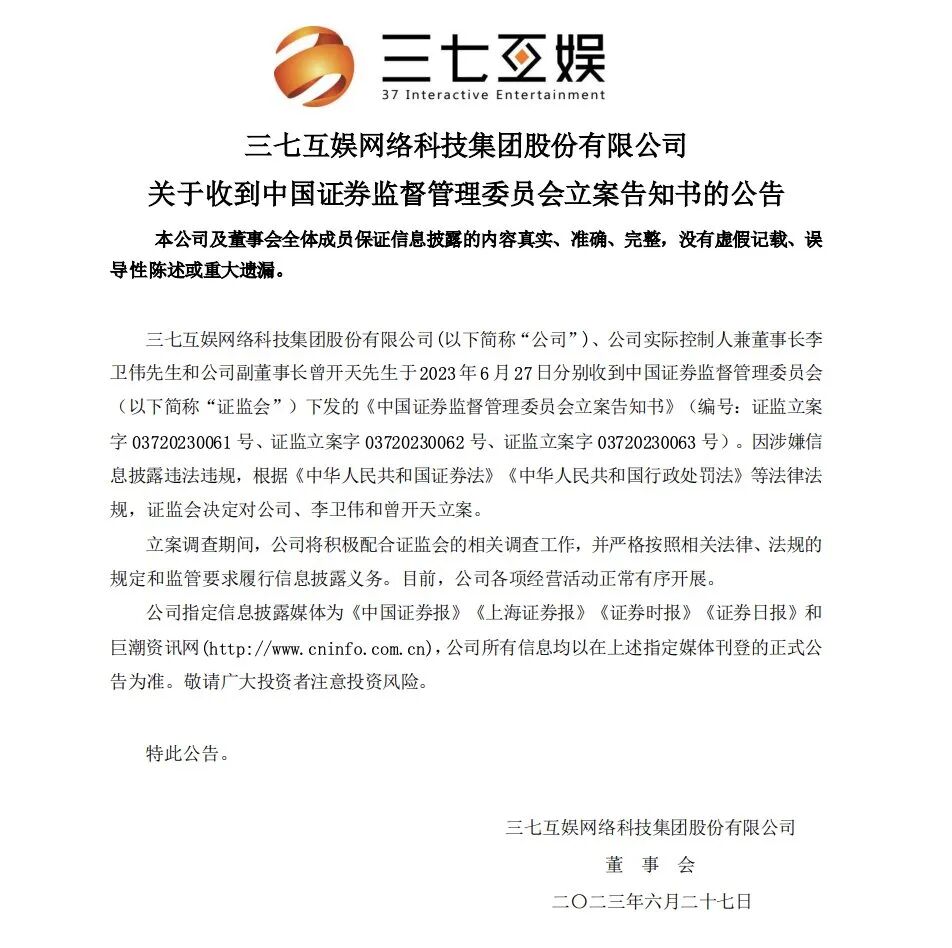 据第一财经,6月27日晚间,游戏公司三七互娱公告称,公司实际控制人兼董事长李卫伟和公司副董事长曾开天于6月27日分别收到中国证监会下发的《中国证券监督管理委员会立案告知书》。因涉嫌信息披露违法违规,根据《中华人民共和国证券法》《中华人民共和国行政处罚法》等法律法规,证监会决定对公司、李卫伟和曾开天立案。