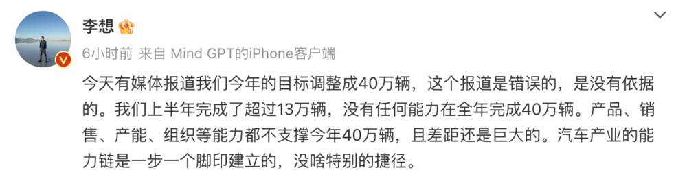 李想在声明中表示:“今天有媒体报道我们今年的目标调整成40万辆,这个报道是错误的,是没有依据的。我们上半年完成了超过13万辆,没有任何能力在全年完成40万辆。产品、销售、产能、组织等能力都不支撑今年40万辆,且差距还是巨大的。”