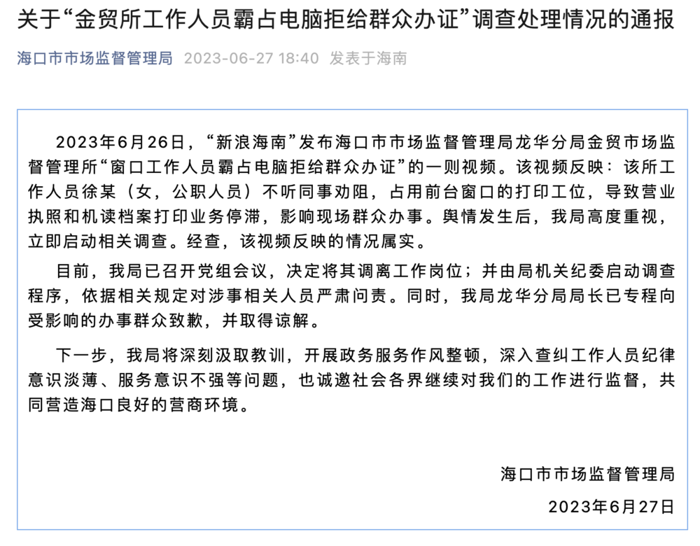 海口市市场监督管理局6月27日通报,6月26日,“新浪海南”发布海口市市场监督管理局龙华分局金贸市场监督管理所“窗口工作人员霸占电脑拒给群众办证”的一则视频。该视频反映:该所工作人员徐某(女,公职人员)不听同事劝阻,占用前台窗口的打印工位,导致营业执照和机读档案打印业务停滞,影响现场群众办事。舆情发生后,该局高度重视,立即启动相关调查。经查,该视频反映的情况属实。