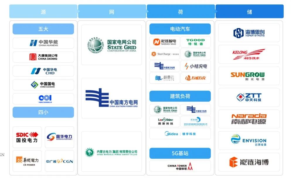 先看“源”端,主要是指传统的五大发电集团和四小豪门,包括华能、大唐、华电、国电、中电投和国投电力、国华电力、华润电力、中广核,业务涉及火电、水电、核电、风电、光伏等。除了五大四小外,未来还会有广泛存在的分布式光伏、风能等运营商,深入到各个用电场景,内外兼修。
