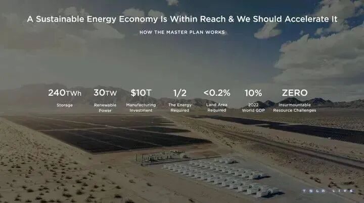 今年3月1日,马斯克对外透露了从地球上抹去化石能源消耗的缜密路线图——宏图计划3,用240TWH的储能、30TWH的可再生电力、14.4亿辆不同类型的电动汽车、消耗电力20PWh/年的热泵组合,在制造领域砸10万亿美元,但只需要0.2%的土地面积,不到化石燃料一半的能源,就能让这个地球上的国家和人口运转下去。